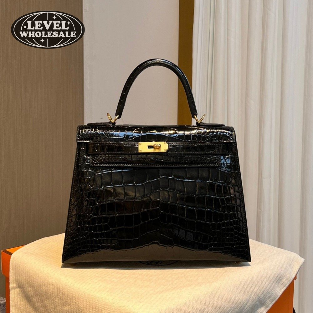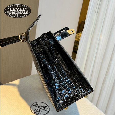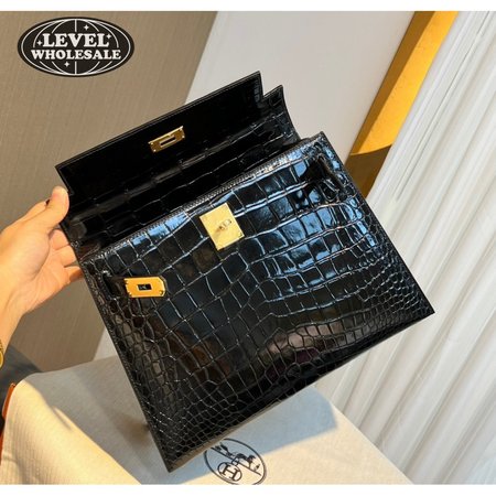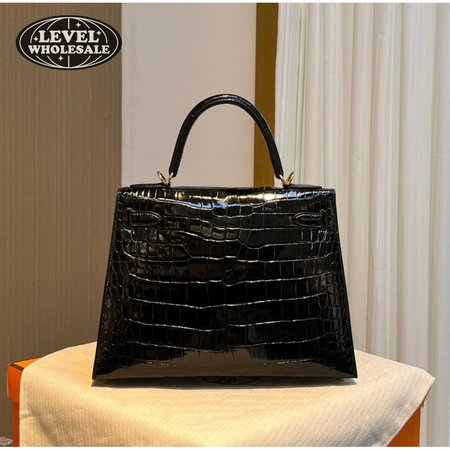 Hermes Kelly 25 HSS Sellier Black Shiny Alligator Brushed Gold Hardware